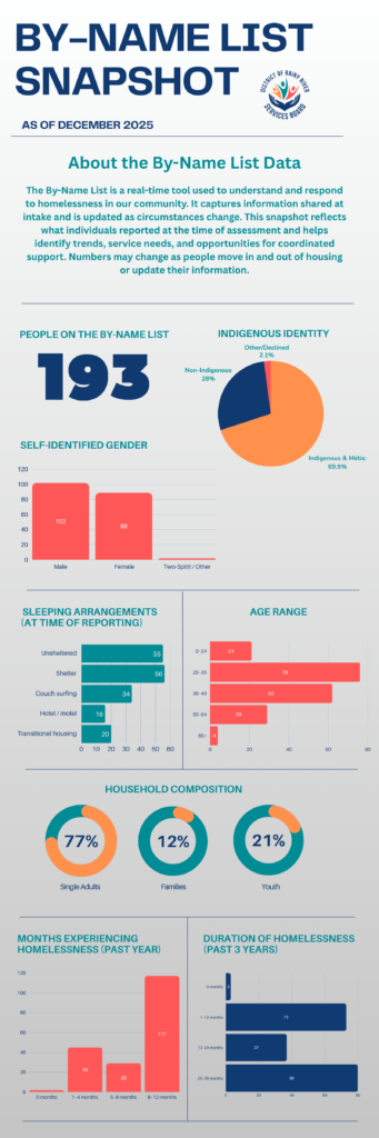 Being included on the By-Name List does not guarantee housing or services. It is one of several tools used by DRRSB and community partners to support a coordinated response to homelessness in the Rainy River District.