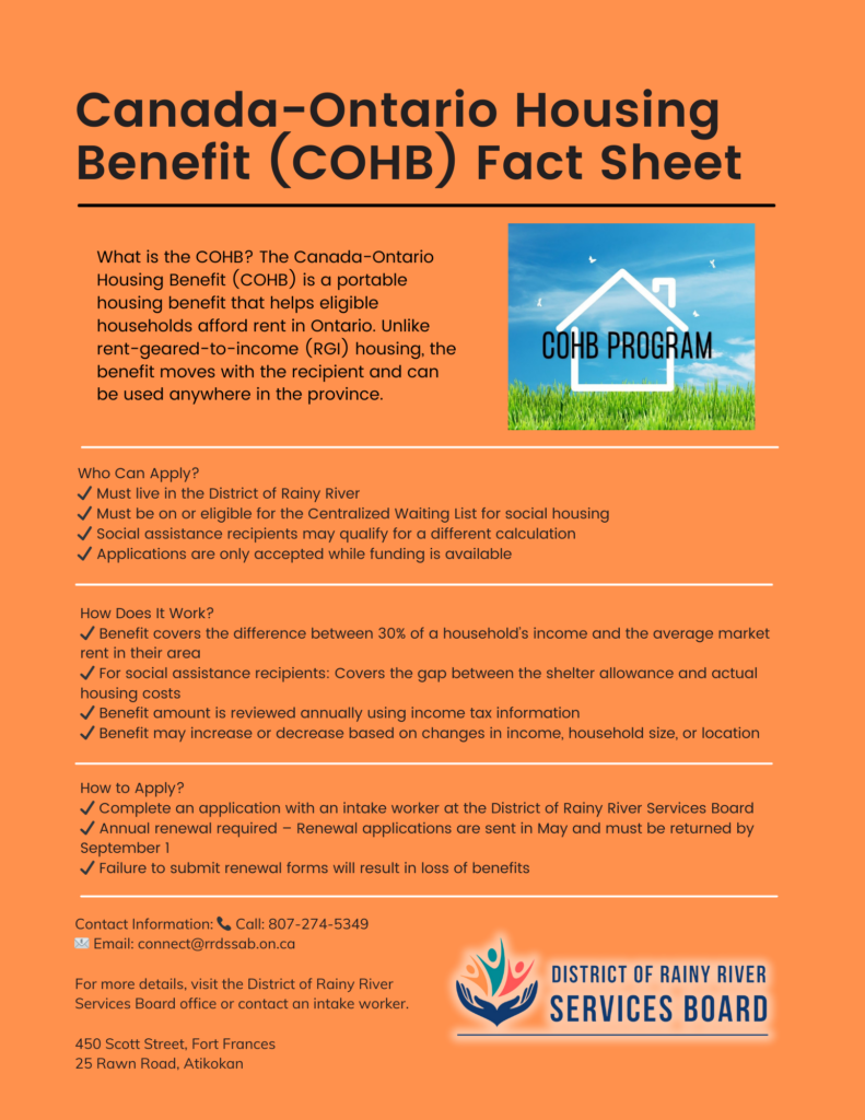 The Canada Ontario Housing Benefit provides portable financial assistance to help eligible households in the District of Rainy River afford rental housing.