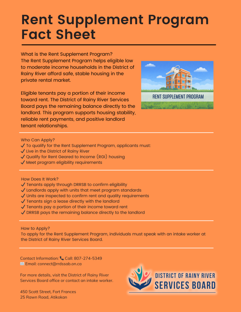 For more information about Rent Support programs, contact the District of Rainy River Services Board: